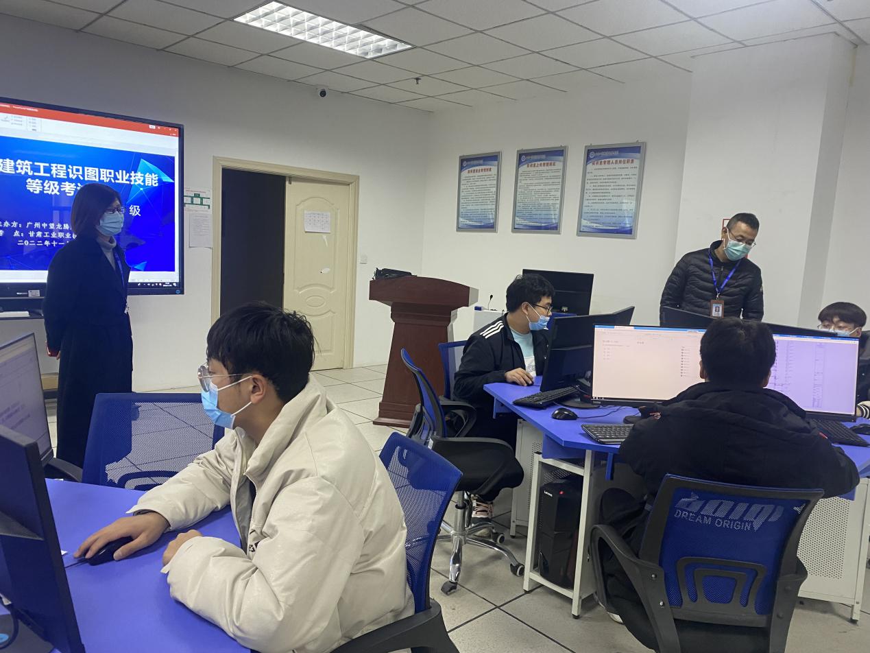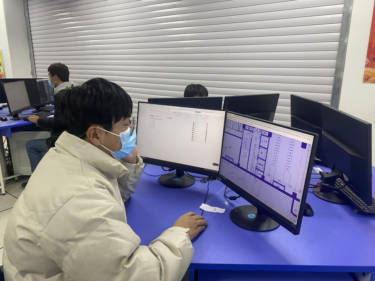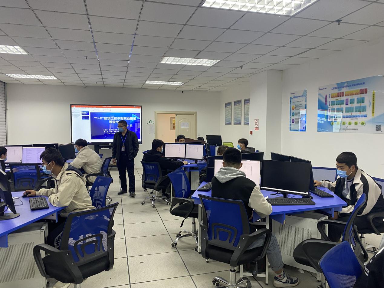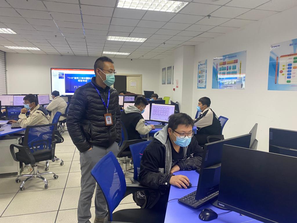 11月19日下午,beat365在线体育在BIM技术中心组织开展了“1+X”建筑工程识图(建筑设计类中级)职业技能等级证书考核。经前期遴选、线上线下培训,最终11名员工参加此次考核。教务处负责人薛亚宏、科长刘青青、beat365在线体育党支部书记、经理谢延友巡查考核现场。