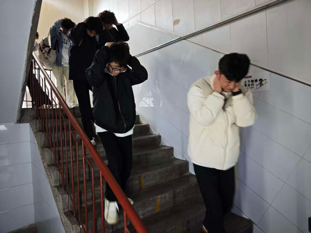 下午2时,演练正式启动。随着模拟地震警报声响起,同学们迅速反应,第一时间双手抱头,躲至书桌下、床沿侧等安全区域,保持身体蜷缩以减少伤害;待“主震”结束后,在团学干部统一指挥下,同学们低姿弯腰、手护头部,按照预定疏散路线快速有序撤离至宿舍楼下空旷集合点。