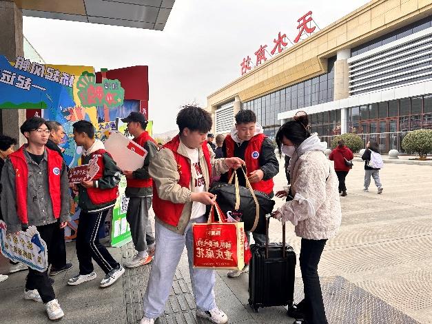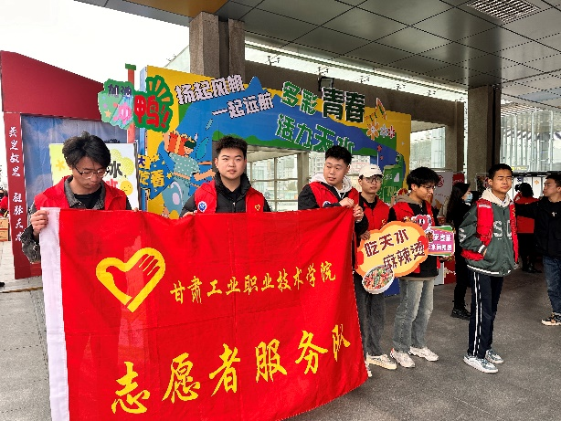 活动现场,志愿者们热情帮助出站游客搬运行李,宣传天水特色人文历史景观,介绍天水麻辣烫、呱呱、然然等独有美食。主动了解外地游客需求,合理安排游客们乘坐公交和出租车。当日恰逢降温,凛冽寒潮抵挡不住游客们向往的心情和甘工院学子的热情,天水不只有热辣滚烫的“麻辣烫”,更有热情好客的“天水人”。
