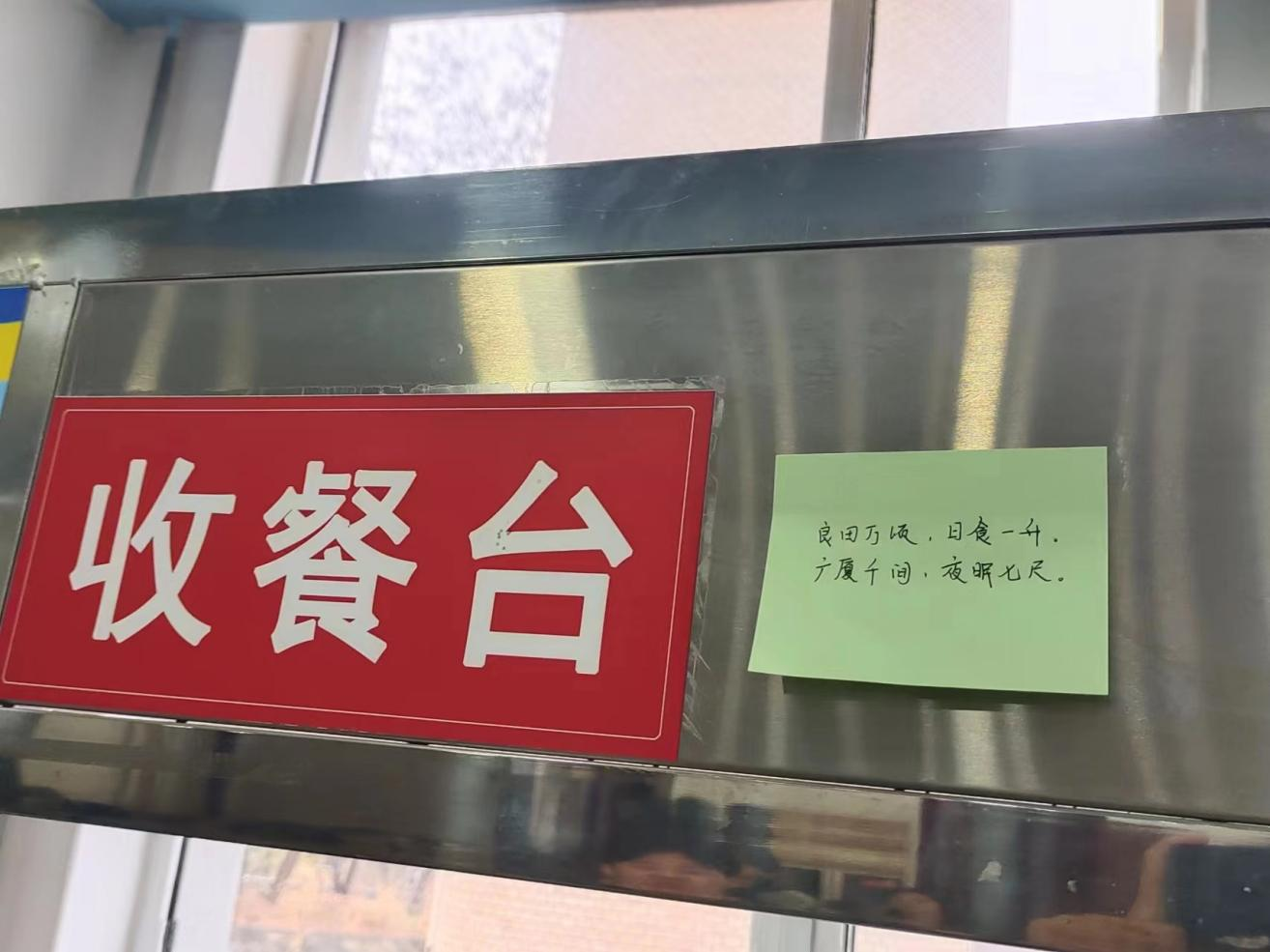 以“节约粮食,拒绝浪费”作为为主题,在员工食堂举办“节约粮食,从我做起”的实践活动。同学们自制宣传标语,将标语贴在醒目位置,以此提醒用餐同学按量饮食,拒绝浪费。引导员工养成良好的习惯,把节约粮食融入生活中,随时随地提高个人节约粮食意识。